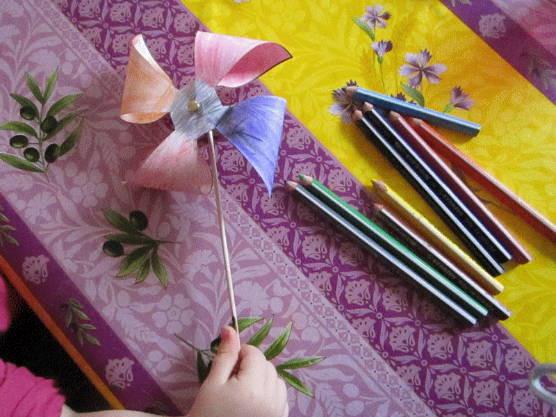 vous connaissez toutes et tous, la fleur des vents, sur laquelle nous nous amusions étant petits, à souffler dessus pour faire tourner l'hélice... ben j'ai trouvé sur http://www.tomlitoo.com/decobrico/fleurdevent/ une rose des vents à créer... et hop nous voilà parties avec loann vendredi après midi à la fabriquer... je l'ai aidée à colorier vers la fin (car trop long à colorier toute seule, prévoir de n'aider que les touts petits, pour les plus grands les laisser faire)...